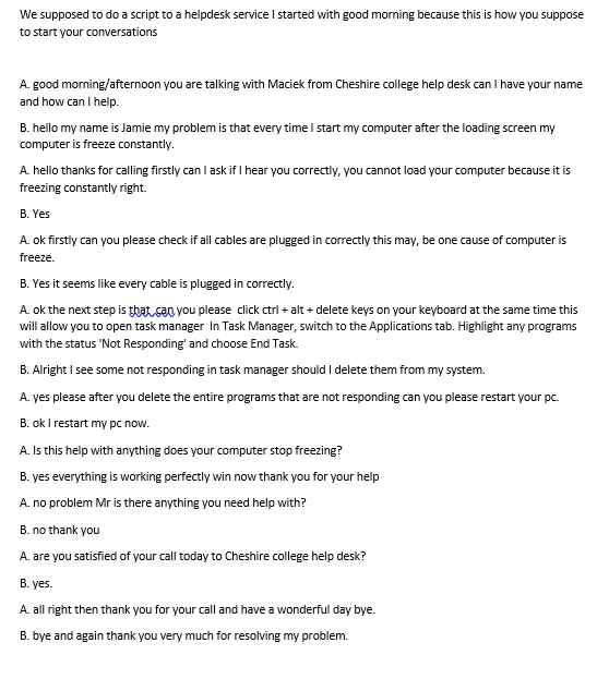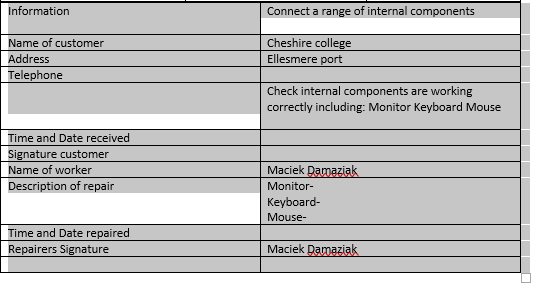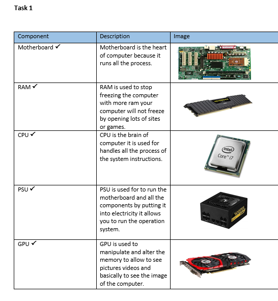 in unit it7 we will be solving some problems in computer hardware/software so basically in Task 1 we have to build and computer and put all the components that will fit each other so basically if you want to put an processor you have to pick an motherboard that have the same socket like processor so for example if you pick processor that have socket LGA 1151 you have to look for motherboard that have the same sockets. We have to build an full computer from the beginning and check if the components are fit right also we have to write what component is for what. so for example we have to put what GPU is used for. The problem that i have is that i was not sure what components are good and i have to ask an teacher to help and they help me and i finish an course with best grade. Task 2 is about make an script to help person that call to the service for help with computer we used to visual the help script desk and put it in word of how the action take place the one problem i face during this task is that i actually does not know how to start the script. However i found an solution in internet and finish this task with best grade the last task in this unit we have to do the log sheets of problems and how to fix the components in this task we have an practical lesson that we have to build an computer from scratch this task was the easiest of all of this unit because i know how to fix the computers because i learn lots from my course. I gave you an screenshots overview of what we have to do for each task